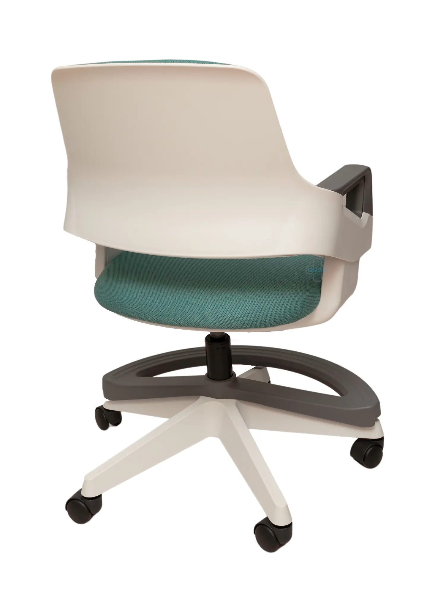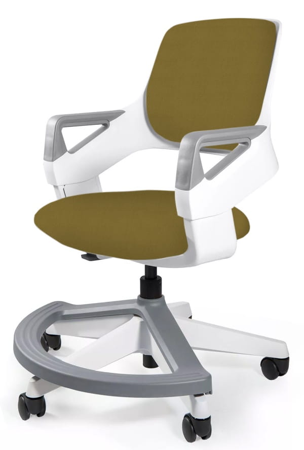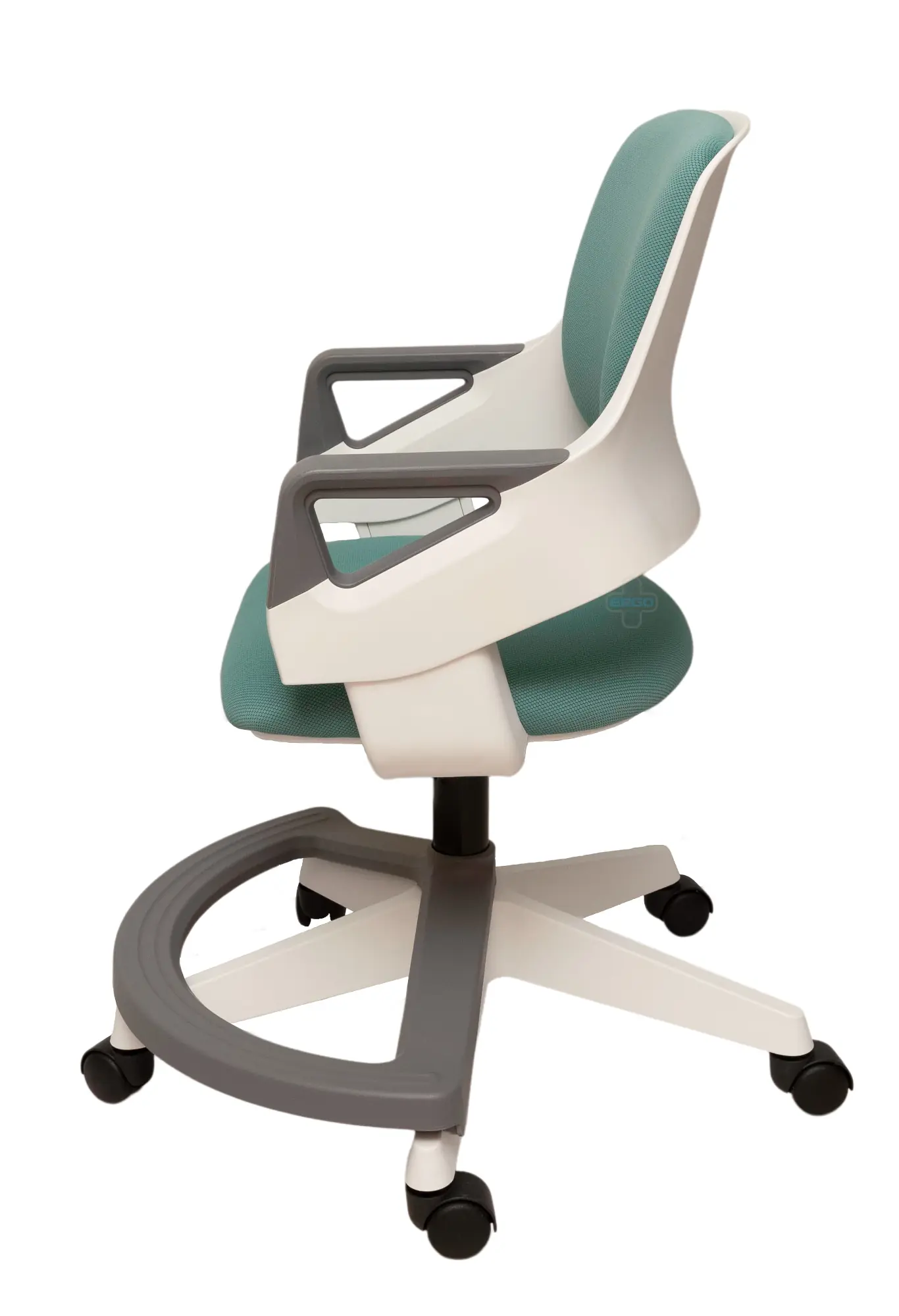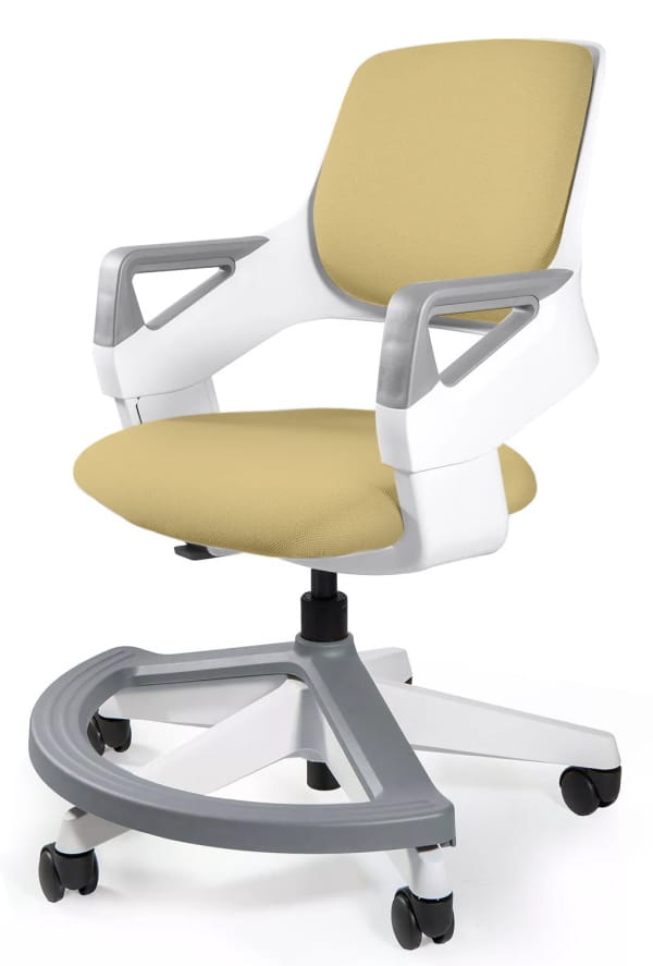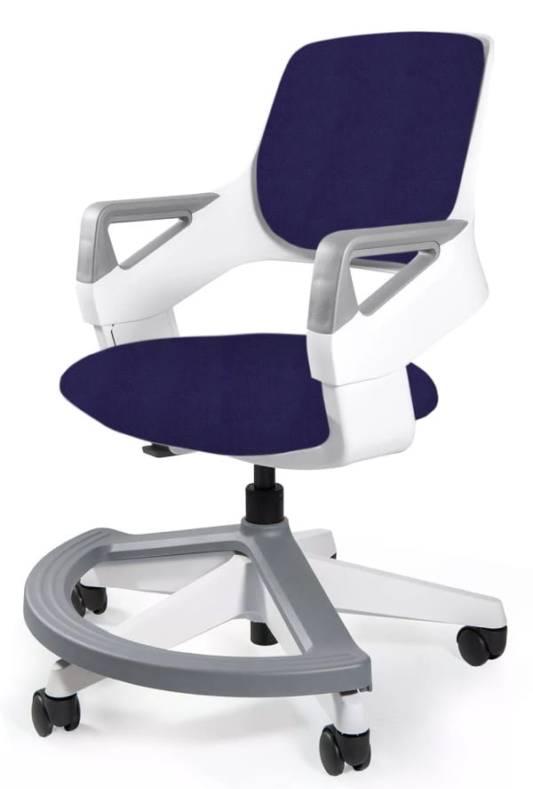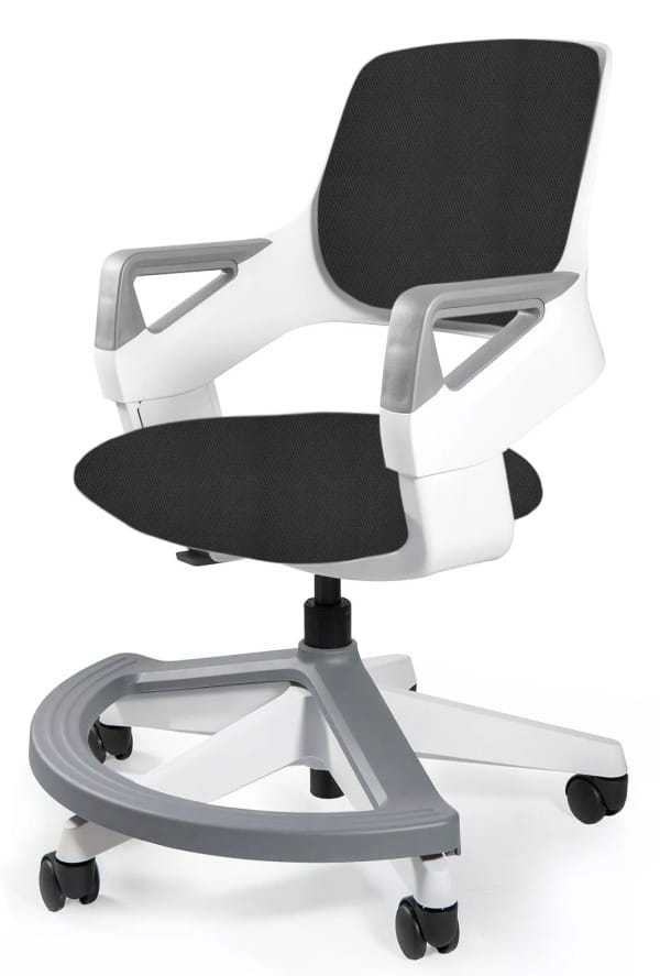 - Aby również mniejsze dzieci mogły swobodnie oprzeć stopy, krzesło Rookee posiada podnóżek zamontowany na podstawie jezdnej - na wysokości 14 cm od podłogi. Dzięki temu odległość od siedziska do miejsca postawienia stóp wynosi: 24 cm - 36 cm. Rookee daje zatem możliwość korzystania z biurka również mniejszym dzieciom - siedzisko będzie odpowiednio wysoko do blatu, a nogi nie będą dziecku zwisały. Kiedy podnóżek pod stopy stanie się zbędny, wystarczy po prostu obrócić podstawę jezdną krzesła tak, by ten podnóżek znajdował się z tyłu fotela. Dlatego Rookee to naprawdę krzesło do biurka rosnące z dzieckiem - zarówno jeśli chodzi o oparcie oraz siedzisko, jak i wysokość podparcia stóp.